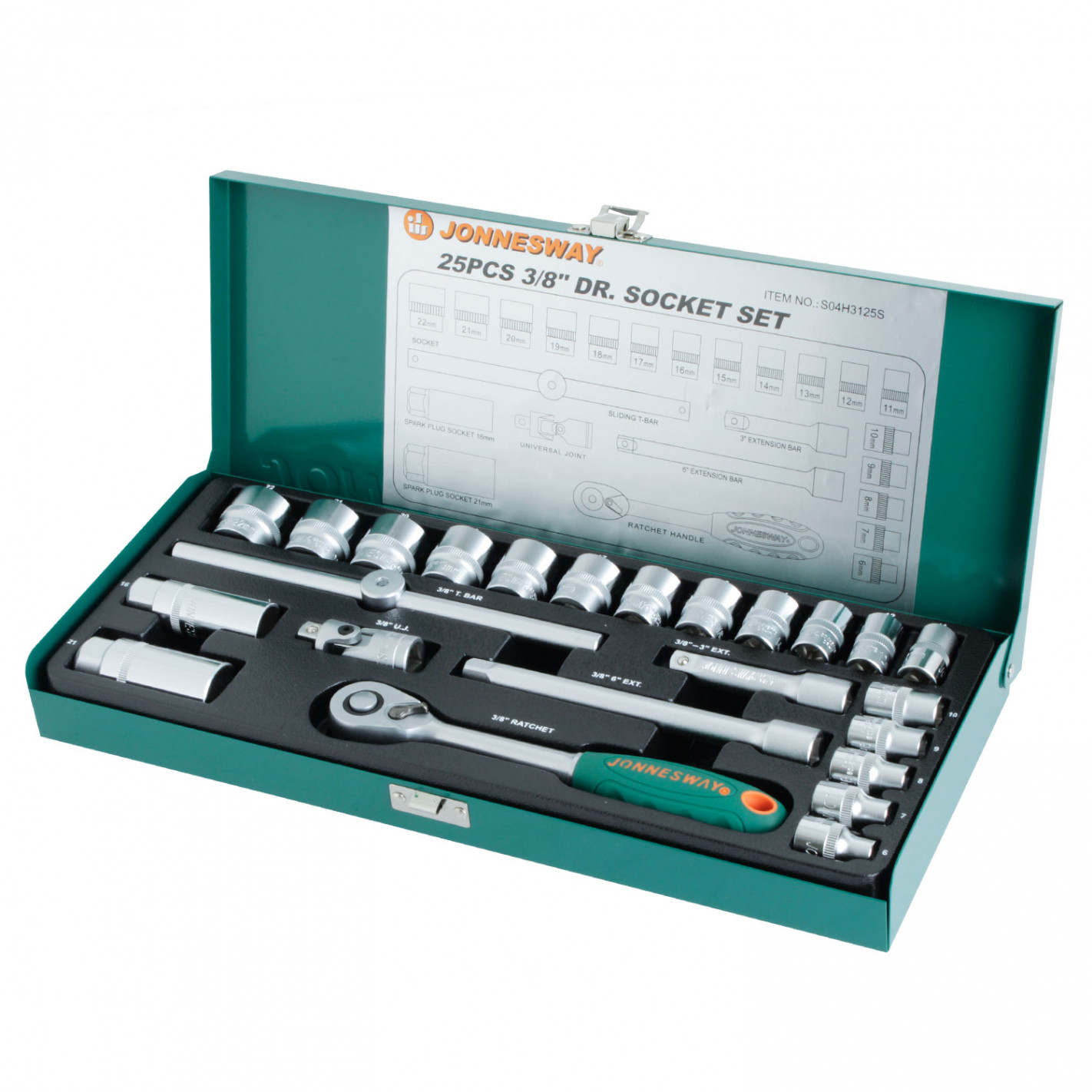 Juego de dados cuadrante 3/8″, 25 pzas. Fabricado en aleación Cromo – Vanadio.Maleta metálica.Chicharra de palma, mango ergónomico antideslizante.